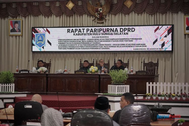 KANDANGAN, narasipublik.net Dewan Perwakilan Rakyat Daerah (DPRD) Hulu Sungai Selatan  (HSS) melaksanakan Rapat Paripurna dengan agenda jawaban eksekutif atas pandangan umum fraksi mengenai Rancangan Peraturan Daerah (Raperda) perubahan Perda Nomor 6 Tahun 2020 tentang pembentukan dan penyusunan perangkat daerah, Rabu (06/08/2025).