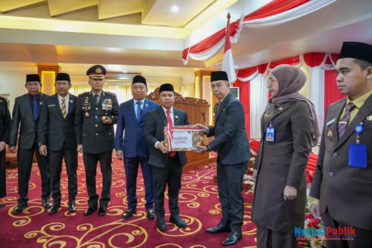 Bupati Tapin H. Yamani secara simbolis menyerahkan bendera kepada para camat di sela rapat paripurna DPRD untuk mendengarkan pidato kenegaraan Presiden RI, Jumat (15/08/2025).