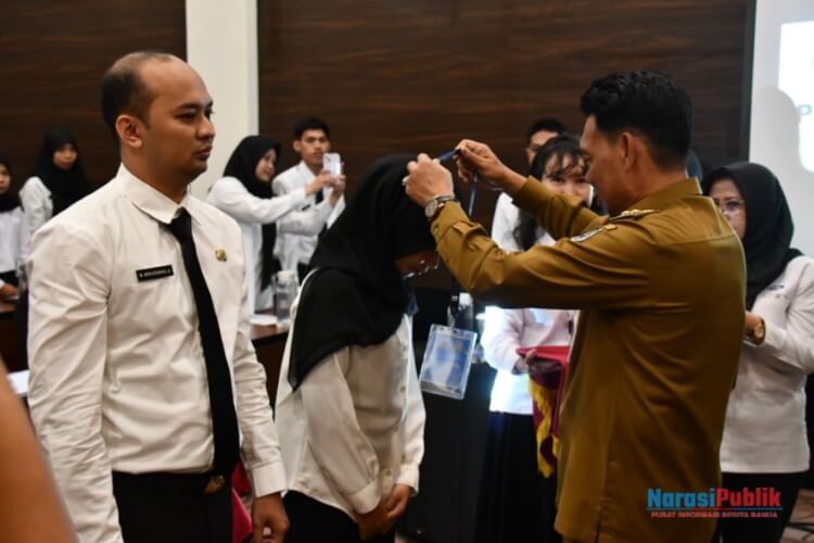 Wabup HSS, Suriani menyematkan Id Card secara simbolis kepada peserta pelatihan APIP. (Foto : Prokopim HSS)