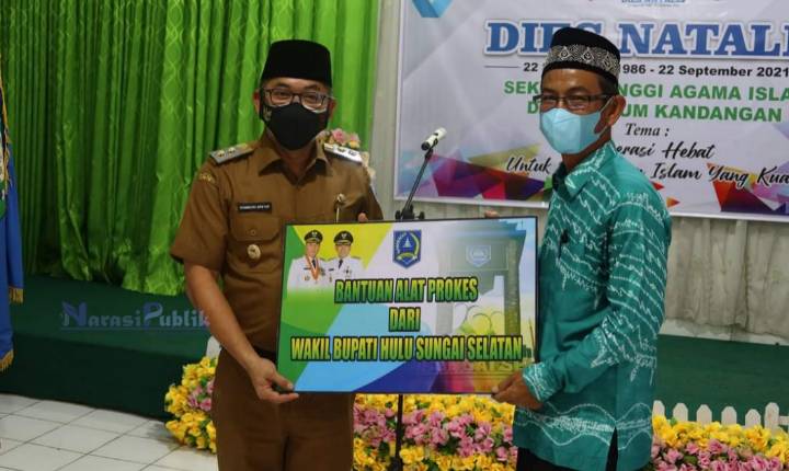 KANDANGAN, narasipublik.net – Wakil Bupati (Wabup) Hulu Sungai Selatan (HSS) Syamsuri Arsyad memberikan bantuan peralatan protokol kesehatan (Prokes) kepada STAI Darul Ulum Kandangan.